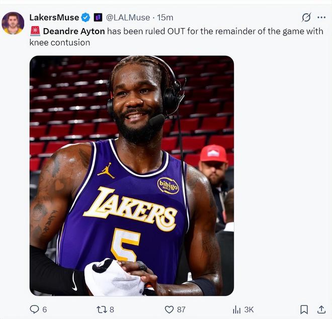 艾顿因为右膝挫伤此役伤退,仅出战13分26秒。